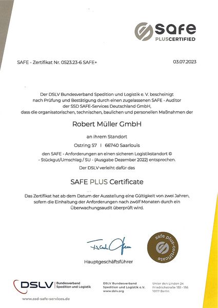 - La sécurité des marchandises de nos clients est d’une importance capitale pour nous. C'est pourquoi nous attachons une grande importance à des normes de sécurité élevées. Grâce à la vidéosurveillance et à un accès restreint aux locaux de l'entreprise, nous sommes testés et certifiés selon les directives S.A.F.E.