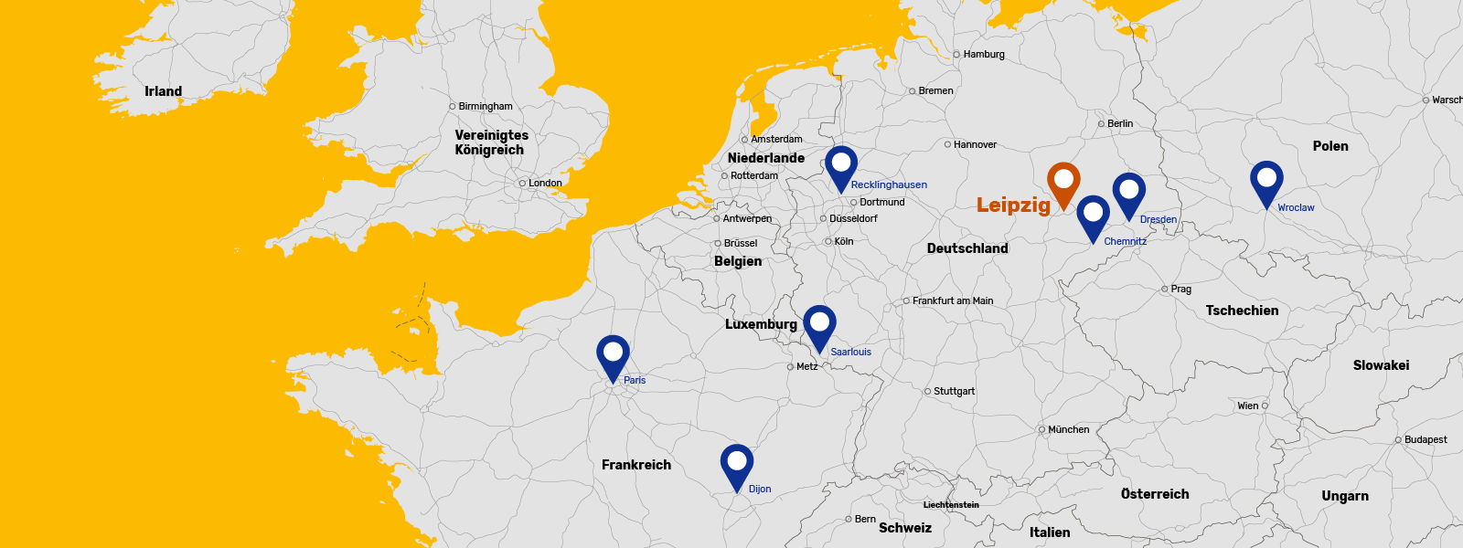 De plus, Robert Müller offre sur son site de Leipzig les meilleures options pour la gestion de lots partiels et complets en provenance et à destination de l'Europe. Avec l'aide d'une équipe d'experts motivés, s’appuyant sur un réseau de partenaires fiables, de nombreuses destinations européennes sont desservies quotidiennement.