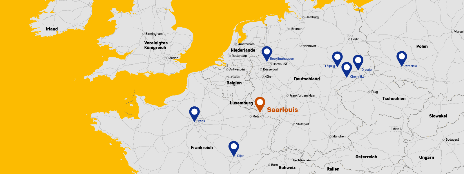 Le siège du groupe Robert Müller est situé à Saarlouis, à quelques kilomètres des frontières franco-allemandes et germano-luxembourgeoises et avec accès direct à l'autoroute A8. Grâce à sa situation centrale avantageuse, notre terminal européen à Saarlouis peut offrir des départs quotidiens avec d'excellents temps de transit dans toute l'Allemagne et l'Europe. Les centres économiques les plus importants d'Europe centrale peuvent ainsi être desservis de manière fiable et rapide dans un délai de 24 à 48 heures.
